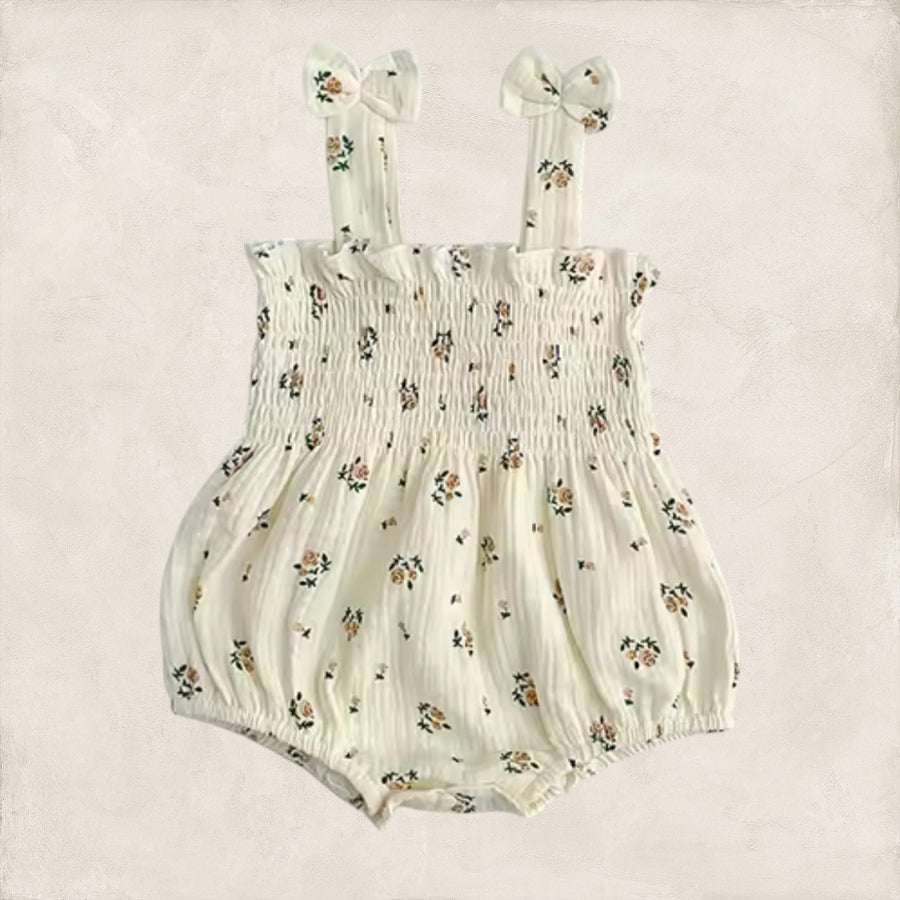 This dreamy romper is a must-have for your little flower! Designed with a soft smocked bodice and delicate floral print, this baby girl romper is as comfortable as it is adorable. The bow-tied shoulder straps add a charming touch, while the bubble-style bottom gives it a classic, timeless silhouette.