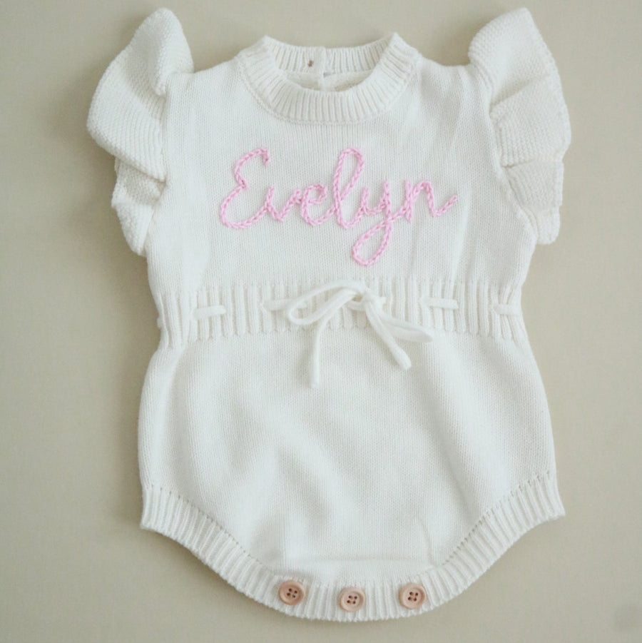 Wrap your little one in softness and sweetness with our personalized knit romper. Made from cozy, high-quality yarn, this romper features delicate ruffle sleeves, a waist tie for added charm, and hand-embroidered personalization across the chest in your choice of thread color. With functional wooden buttons for easy diaper changes, it’s as practical as it is precious.